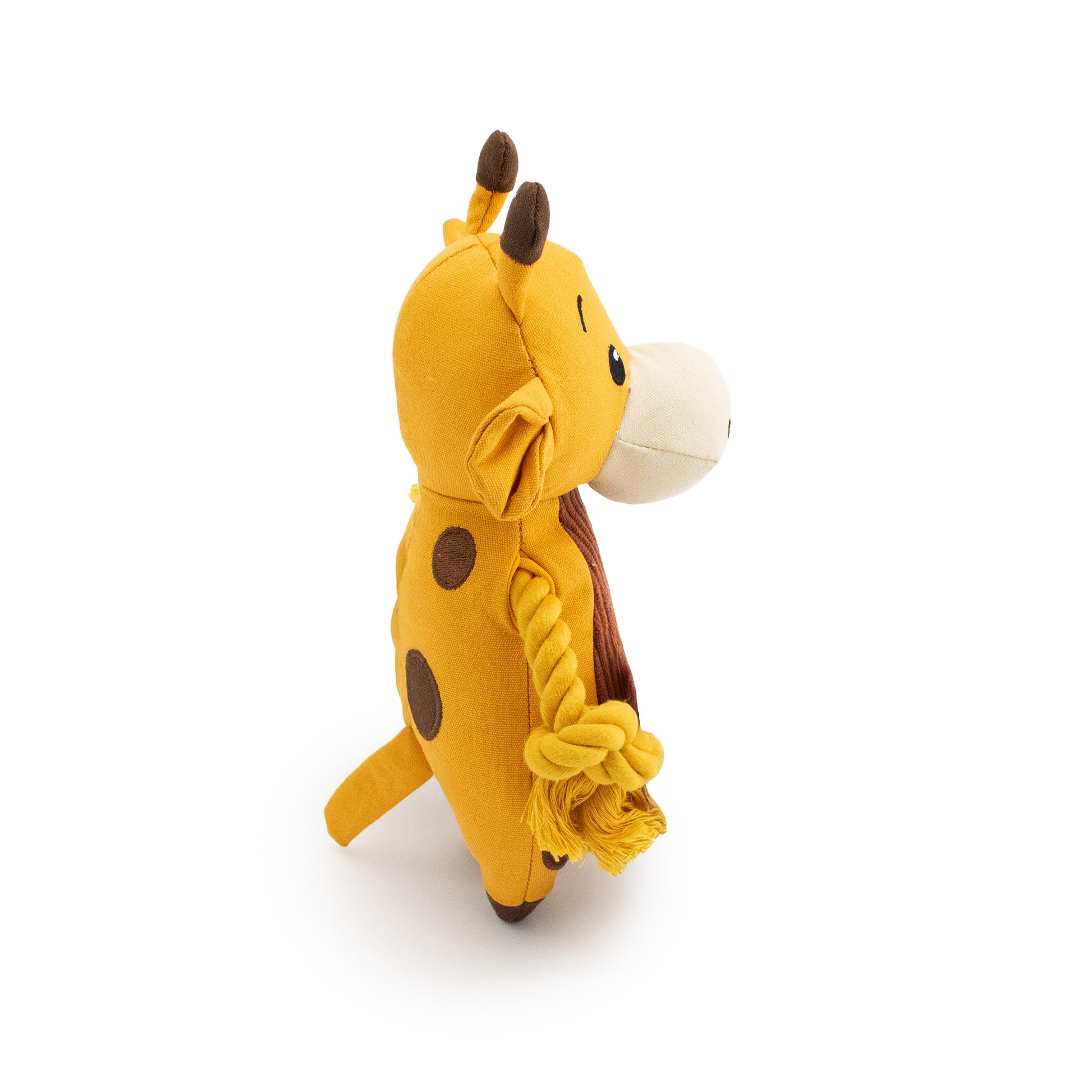 9" Canvy Giraffe w/ Squeaker, Crinkle & Rope is a soft and snuggly plush dog toy designed to bring joy to your pup's playtime.